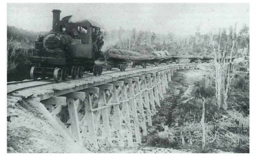 Photo 3 - Dispatch #140 Built 1913 for Westland Sawmilling Co. Camerons. Note the light rail and substantial trestle. (MOTAT col.)