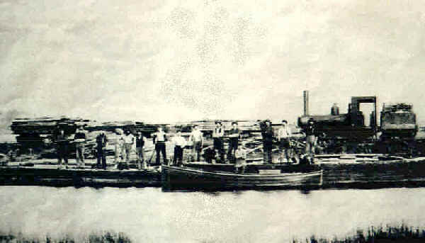 Taken in 1505, No.1 pauses at Moa Flat to unload timber onto punts for transport to Riverton.