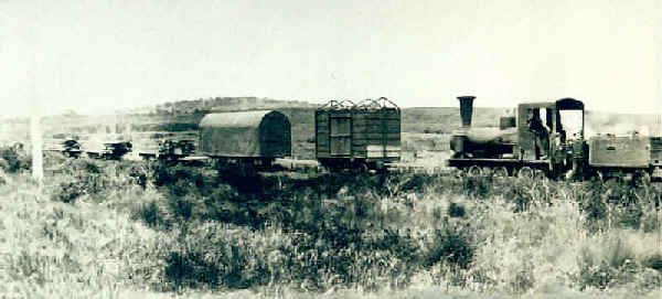 One of More's Johnston 'A's at Longwood with the daily sawn-timber train. The round roof wagon is for general supplies, the other wagon is for live cattle