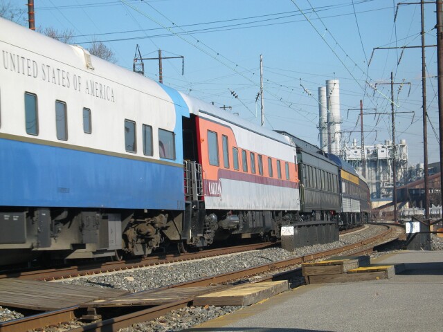 The Liberty Limited (aka OCS-101, Amtrak 802 and CSX P954) consist: Juniata Terminal Pennsylvania Railroad E8A 5711 and 5809, private varnish cars Southern Pacific "Birch Grove", Ohio Central "Sugar Creek", Louisville & Nashville "Ohio River", Chesapeake & Ohio "Chapel Hill", Missouri-Kansas-Pacific #403, High Iron Travel "Caritas", "Railforce One - United States of America" (aka North Star), Charter "Golden Moon", Charter "Imperial Leaf", Morristown & Erie "Birken", "Silver Shore", Louisville & Nashville "Oliver Hazard Perry", Lancaster & Chester "Golden Tower", "Greenwich Harbor", Virginia Rail Investments "Kitchi Gammi Club" and Juniata Terminal's "Little Juniata Rapids", "Warrior Ridge" and "Pennsylvania" (aka "PRR 120"). |