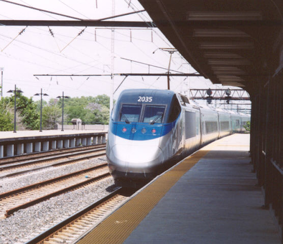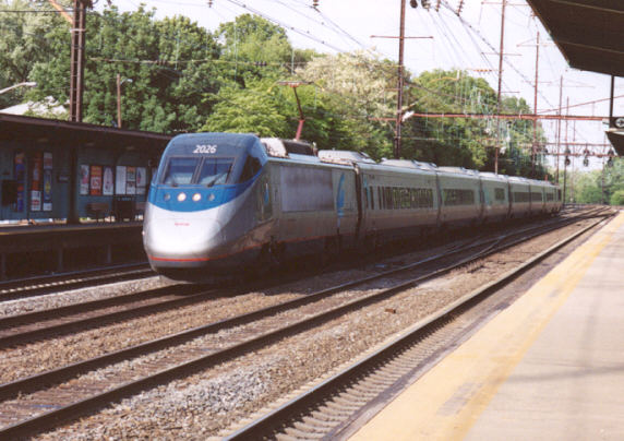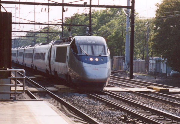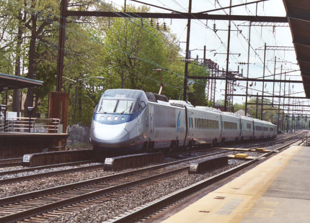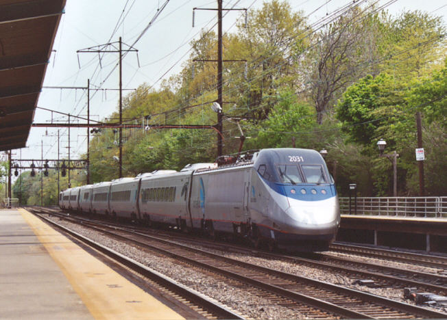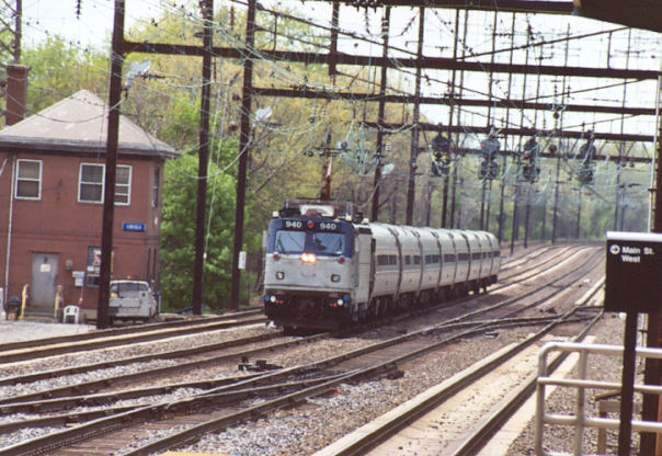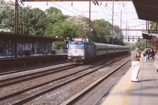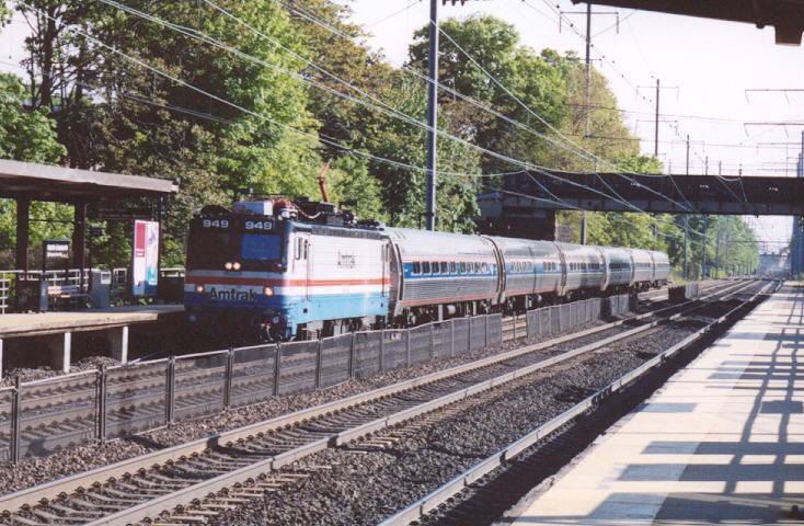 Amtrak AEM-7 925 passing through Metuchen station. |