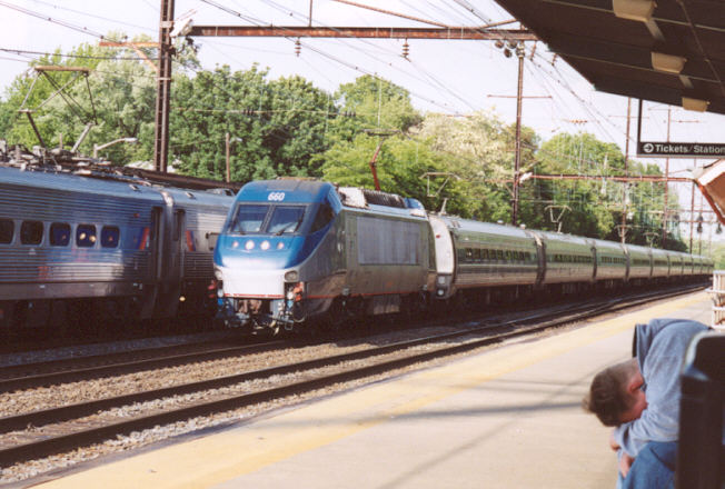 Amtrak HHP-8 660 passes a stopped NJT train at