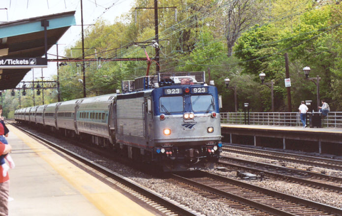 Amtrak AEM-7 923 passing through Metuchen station. |
