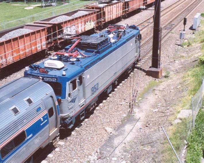 Amtrak AEM-7 940 passes Lincoln Tower. |