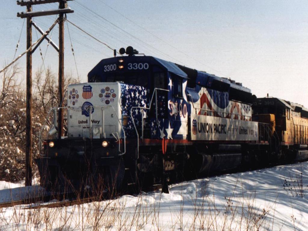 17th street is the first at grade crossing, a UP SD40-2, 3300 the United Way Locomotive,