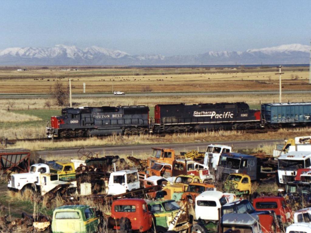 of the tracks through here. SSW GP60 9689 is rolling by an old truck wrecking yard.