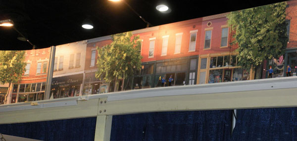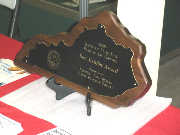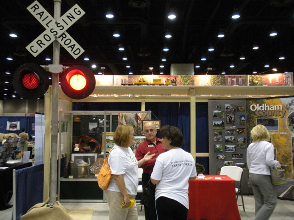 In 2008, the Ohio Valley Railroad Historical Foundation was contacted by Shane Best of the LaGrange Tourism Bureau about the possibility of building a model railroad to run around the top of the Oldham County "Pride of the Counties" Kentucky State Fair booth. Larry Duff of the Foundation designed and built the track system. Members of the Foundation mounted it ten feet above the booth where it ran in front of a photographic pantographic view of Main Street in downtown LaGrange, Kentucky. The Foundation also furnished a railroad crossbuck with flashing lights to draw attention to the booth. The LaGrange Tourism Bureau was the recipient of the Best Exhibit Award and the Foundation sincerely hopes our efforts contributed toward the attainment of this Award. You can view photos of the exhibit along with some railroad relics in the Slide Show below. Please be patient while I add more photos. | |