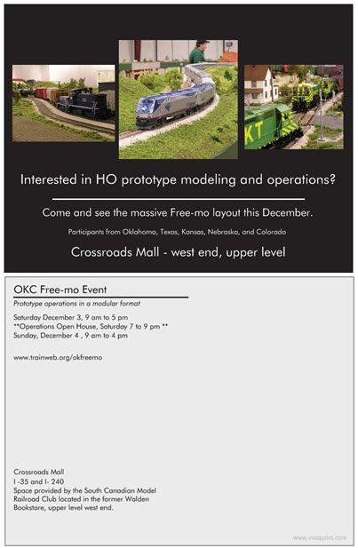 We are an association of modelers in central Oklahoma building to the HO scale Free-Mo standards. The group exists to promote the hobby of prototypical model railroading and the Free-mo