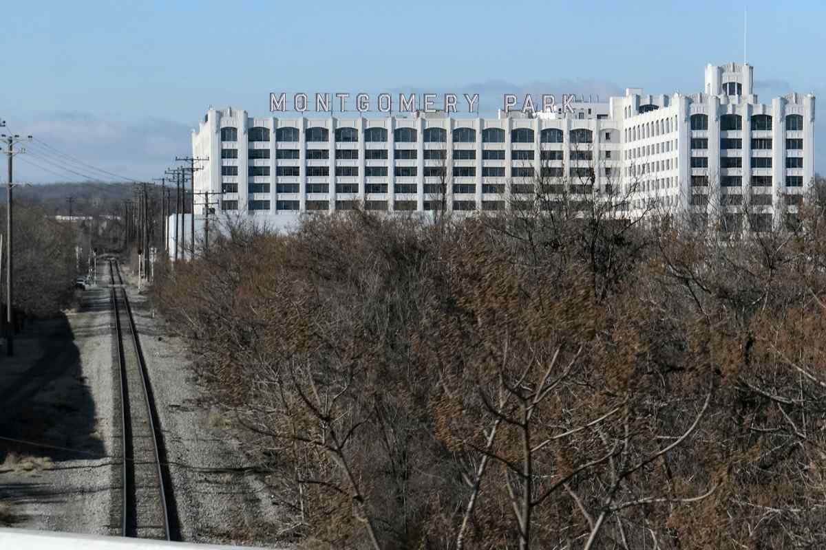 Two light-colored poles suspend the trolley wire. The one on