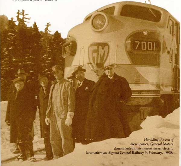 EMD-built General Motors demonstrator units. The Algoma Central Railway started dieselizing in the spring of 1951 with the arrival of four GP-7's, 150-153, from General Motors Diesel, London, Ontario. The road was completely dieselized by June 1952. The last steam engine to run was #33 on the 15.00 - 23.00 yard job at the end of June. The Algoma Central was also one of the first to be completely radio equipped in Canada. With the coming of the diesels things changed drastically. Crews were eliminated, trains grew longer, and the attitude of the men changed. With tape equipped speedometers, speed limits were rigidly enforced, something that was unheard of before. Men just came to work every day and ran the locomotives, if they broke down, they just shut them down or set them off. They carried no tools to repair them. Some of the romance of railroading was gone. At the same time that the diesels arrived, Algoma Steel Corporation started to expand and increased production from 60,000 tons per month to 230,000 tons per month. As the paper companies' forest cutting limits are reached, ACR freight traffic is becoming more dependant on steel products and bridge traffic from CP and CN to the Soo Line, whilst pulpwood traffic is in general decline. Of the twelve pulp spurs (Wyborn, Mile 292, Stavert, Delray, Ripco, Coppell, Meade, Boon, Hale, Hansen, Mile 246, and Mosher), only Wyborn and Mile 246 remain. Of the ten log spurs on the Soo Subdivision (Tabor, Mile 104, Hubert, Regent, Mile 88, Mile 84, Batchewana, Mile 77, Mile 74 and Summit), none remain. Present day (1975) operations on the Soo Subdivision are as follows: Mainline freights leave Sault Ste. Marie approximately every eight hours for Hawk Junction. Usually three SD40's or five GP7's are assigned. Due to their weight and six wheel trucks, the SD40's are confined to this Sub. The 07.00 and 15.00 trains are 99% ore empties for Wawa. The 23.00 train is a train of steel products from Algoma Steel for the CP at Franz and the CN at Oba, filling out on empty ore cars. The wayfreight runs Thursday only northbound. There is no southbound wayfreight, the crew returning as an extra train with iron ore. The 07.00 trains the little miscellaneous switching left on the subdivision. The transit time for freights from Sault Ste. Marie to Hawk Junction (165 miles) is 7-8 hours with GP7 power or 6-7 hours with SD40 power. Train lengths are typically 80 to 125 cars. Passenger service has greatly expanded since steam days. The ACR started the Agawa Canyon Tour in 1952. For $5.00 you could take a one day round trip from Sault Ste. Marie to Canyon (114 miles). There was a two hour stop-over to enjoy a picnic lunch and children could play on the swings and slides whilst others could wet a fishing line in the nearby Agawa River. That year 450 took the trip. Since then, the railway has put on an extensive advertising campaign in the United States resulting in a vast influx in tourists to the Soo area. The most popular time of year is the fall, when the Agawa Canyon Tour operates a full 23 car consist, with overflow being taken by regular trains #1 and #2. To make better use of the passenger cars the ACR started a winter tour called the Snow Train. Although passengers are not allowed out of the train at the north end, its popularity is increasing. Regular passenger service is seven days a week form May to November. During the winter months #1 operates northbound on Friday, Saturday and Sunday, with #2 working south on Saturday, Sunday and Monday. All of this expanded service forced the railway to purchase secondhand passenger equipment from CP, DR&GW, AT&SF, GM&O and Central of Georgia. The latest to arrive were were seven sets of articulated coaches from Southern Pacific. They are 132 feet long and ride on three, four-wheel trucks. The passenger trains are limited to 23 cars. The tour train which often runs at this length is made up as follows: 4 GP7's, 1 steam generator car, 2 baggage cars, 9 coaches, 2 diners, 9 coaches. The 23 car limit is the maximum that can be run around at the station and also the capacity of the make-up track in the coach yard. With the pulpwood business declining, only one Northern Subdivision crew is ordered at 07.00 to Hearst every day. Usually one unit is required but if needed a second is added and is given over to a southbound train at the meeting point. The trip consists of switching the new lumber mill of Dubrieul Lumber Co. at Mile 184, set off and pick up from the CN at Oba and any switching required at Wyborn. The swing crew at Hearst has benn eliminated. The three crews assigned, work first in first out as before, which works out as work two days, one day off. Passenger train crews work through from Sault Ste. Marie to Hearst. The train consist north of Canyon is usually 1 steam generator car, 2 baggage cars and 1 coach. On the Michipicoten Subdivision, things are much slower than in steam days. With the loss of the coal business and ore shipping at Michipicoten, the Brient terminal is closed. The only shipper left is Imperial Oil Ltd. When the ore bucket line as increased from one ton to three ton buckets, train service from Helen Mine and over the Helen Mine Subdivision was stopped and the track removed. At the same time a new branch starting at Mile 12.5 of the Michipicoten Subdivision was built to serve the new McLeod Mine. This was known as the Siderite Subdivision and was 3.2 miles long. Service began by running two 40 car trains for green ore per day, 7 days a week. This service continued until 1972 when it was reduced to an irregular basis. It is now out of service. At Hawk Junction, four crews work the Michipicoten Subdivision on a first in first out basis in road switcher service. They are called in time to be on duty on the arrival of iron ore emoties from Sault Ste. Marie. The yard crew has been eliminated. Four units are customary with trains as follows: Caboose, iron ore empties, coke braize, Wawa miscellaneou