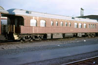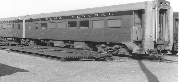 Passenger Equipment In 1949 steel passenger cars finally came to the Algoma Central, although like much of its earlier equipment, it was secondhand. From the Denver and Rio Grande Western came 13 light 4-wheel truck open window coaches, three of which were converted into cafe cars. Also acquired were five ex U.S.Army troop box car style sleepers only built in 1944 for World War II use, these were converted into baggage cars. Old wooden passenger coaches were downgraded to work service equipment and served for many more years until replaced by the ex D&RG steel coaches or modular units on flat cars. More steel coaches came, this time modern, lightweight steel air conditioned picture windows cars from the Canadian Pacific Railway which was reducing its passenger service. A total of 18 of these cars came between July 1969 and December 1972 following which most of the old coaches went into work service or were sold off. Still more used cars were bought in 1973, once again from U.S. roads including 6 coaches built by AC&F in 1947 and 14 articulated coaches from Southern Pacific. Each of the pair of articulated coaches only seated 50 passengers. These latter cars were not well liked and most wound up in work service. Three dining cars (one stainless steel) were also acquired along with three stainless steel baggage cars. Private Business Cars