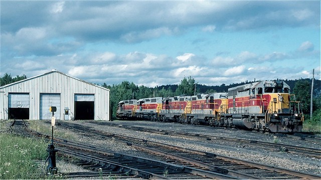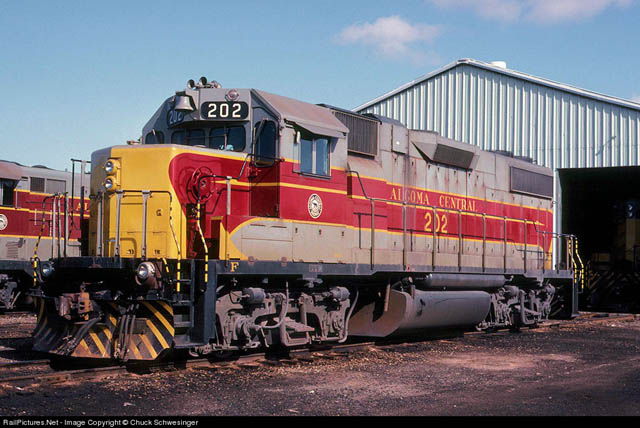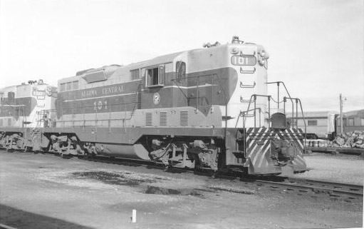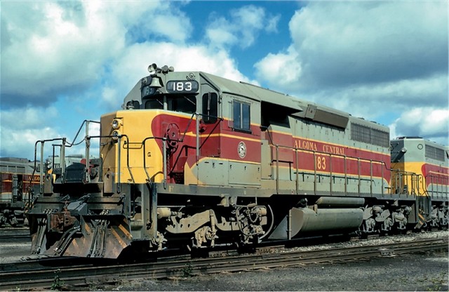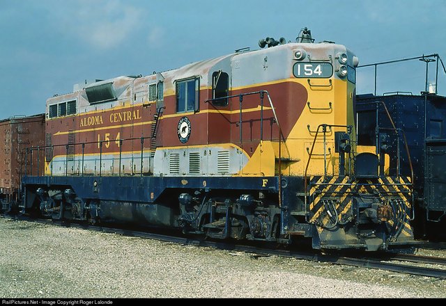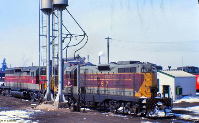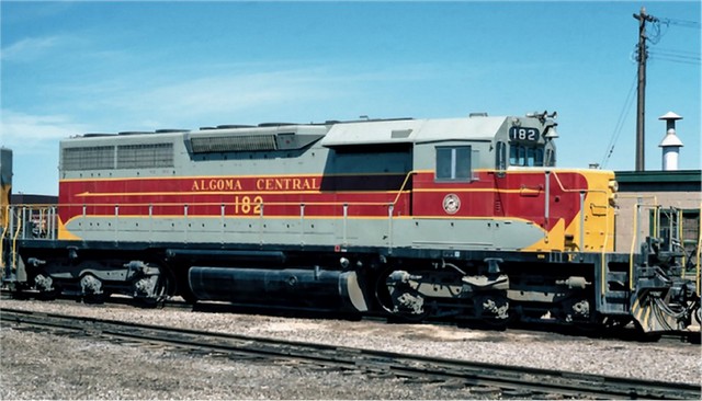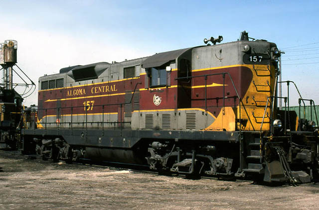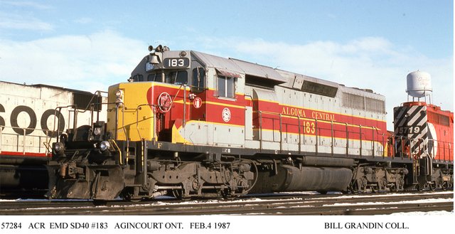 Diesels In February 1950 General Motors sent two of their three demonstrator diesel A & B road units along with a CPR dynamometer car for a winter test on the ACR. In June 1950 the CPR provided two MLW RS-2's 8405, 8406 for testing as well. These were the only demo units needed to see that steam was obsolete. Dieselization came quickly when 39 steam locomotives were replaced by just 21 diesels. Delivered in January 1951 were 5 GMD GP7 road switchers geared for only 55 mph (same as TH&B), followed in September by 14 more plus 2 SW8 yard switchers. A further 2 GP7's delivered in January 1953 finished off steam and in April, ACR became the first railway in Canada to be dieselized. Increased traffic resulted in 2 GP9's being delivered in August 1963, these were geared for the more normal 65 mph.