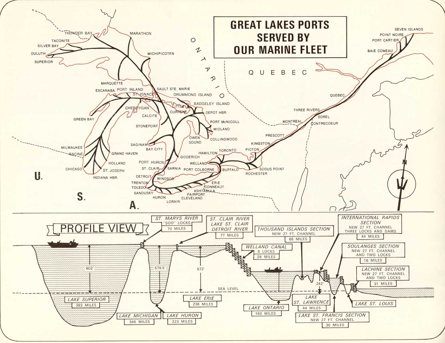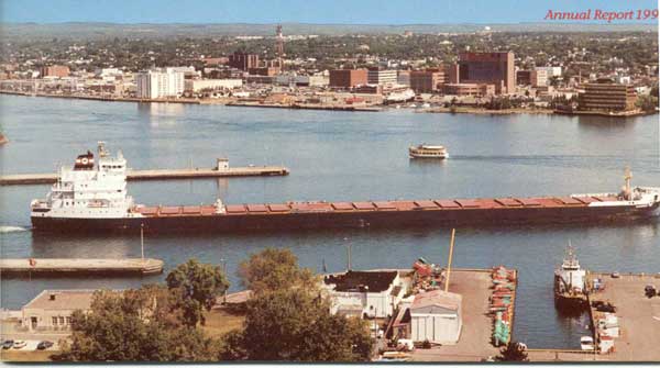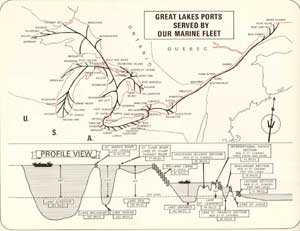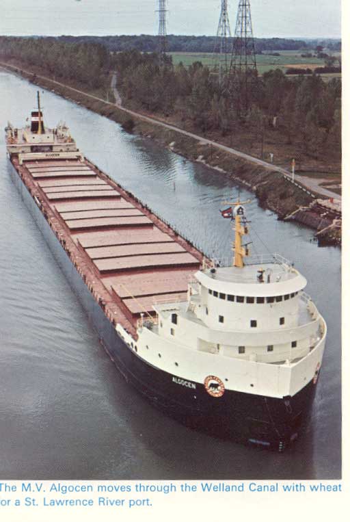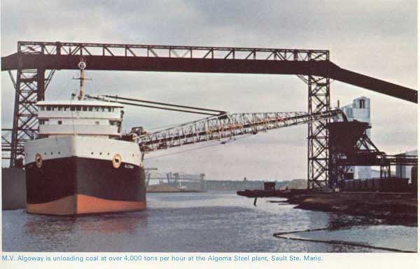 Ste. Marie, Michigan.1991 Major changes in the Marine Division took place in the years following the opening of the St.Lawrence Seaway in 1959. A large fleet of ships was acquired, many built by Canadian Shipbuilding & Engineering Ltd. in Collingwood with concentration on maximum Seaway-size self-unloading bulk carriers. Year after year this fleet was modernized and added to. In 1974 there were 9 ships handling bulk cargo, including grain, iron ore, limestone, salt, sand and coal. In 1978 there were 15 ships and by the end of 1994 (when the railway was sold off) the fleet had grown by acquisition and new construction to 24 ships. Grain was handled from Thunder Bay and Duluth, Minnesota to Montreal, Quebec City, Baie Comeau and Port Cartier. Ships then went "in ballast" (deadhead) to nearby Point Noire and Sept. Iles to load iron ore for Lake Erie USA ports, following which they were in ballast to Thunder Bay or Duluth again. Salt from Goderich and Windsor went to Canadian ports as well as Chicago, Milwaukee, Green Bay etc. Returning with coal and bentonite clay from Wyoming by rail to Point Noire where the bentonite was used to bind ore pellets. Sand was carried to Hamilton and Windsor for foundries. There was also limestone from the US. Coal from Ashtabula and Conneaut, Ohio to Thunder Bay for the Ontario Hydro generation plant. Iron ore also came from the Steep Rock mine in Northern Ontario, beginning in July 1945, via the CNR to Thunder Bay where ACR ships such as the Algoway (with a crew of 29) loaded 16,000 tons of it. Tonnage handled increased repeatedly as more and more ships