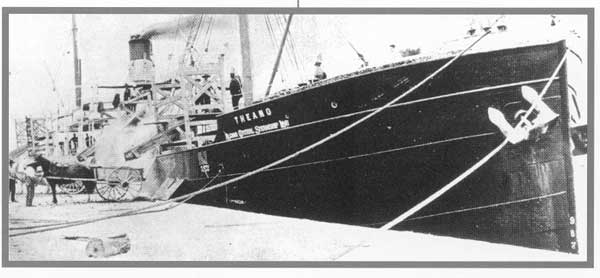 S.S. Theano one of the first four vessels purchased in 1900. At the time of the opening of the new coal dock in Michipicoten in 1929 there were only three ships remaining in Algoma Central's fleet. The Great Depression was immediately upon the land and it wasn't until the spring of 1939 that ore shipments resumed from Michipicoten harbour at the rebuilt dock. This time is was sinter that was shipped to Algoma Steel.
