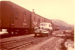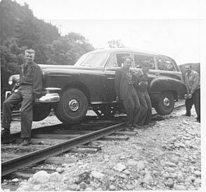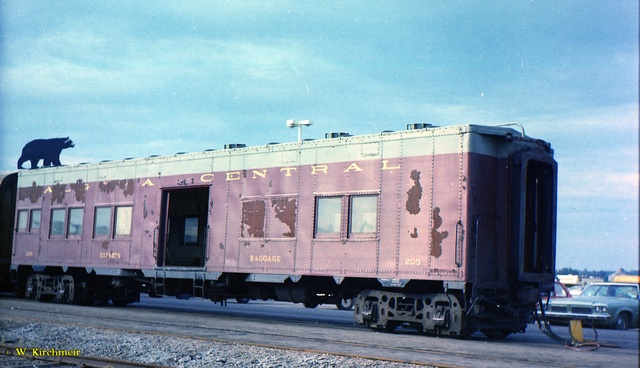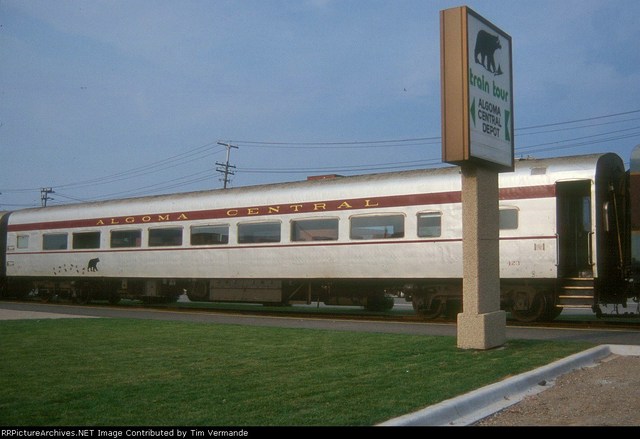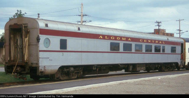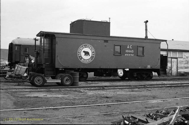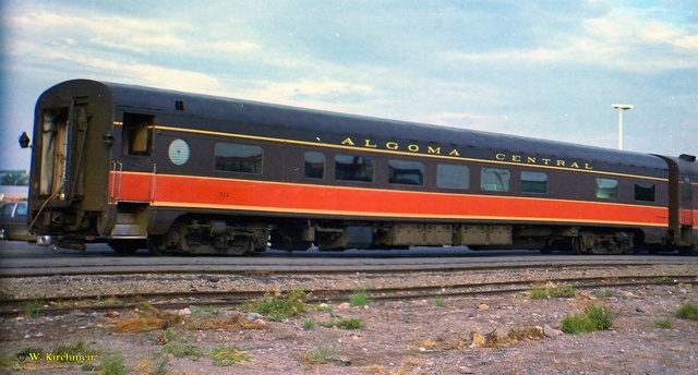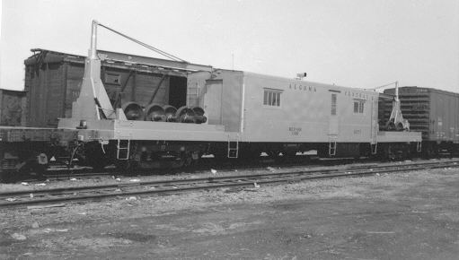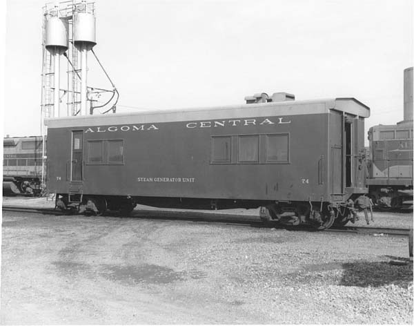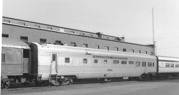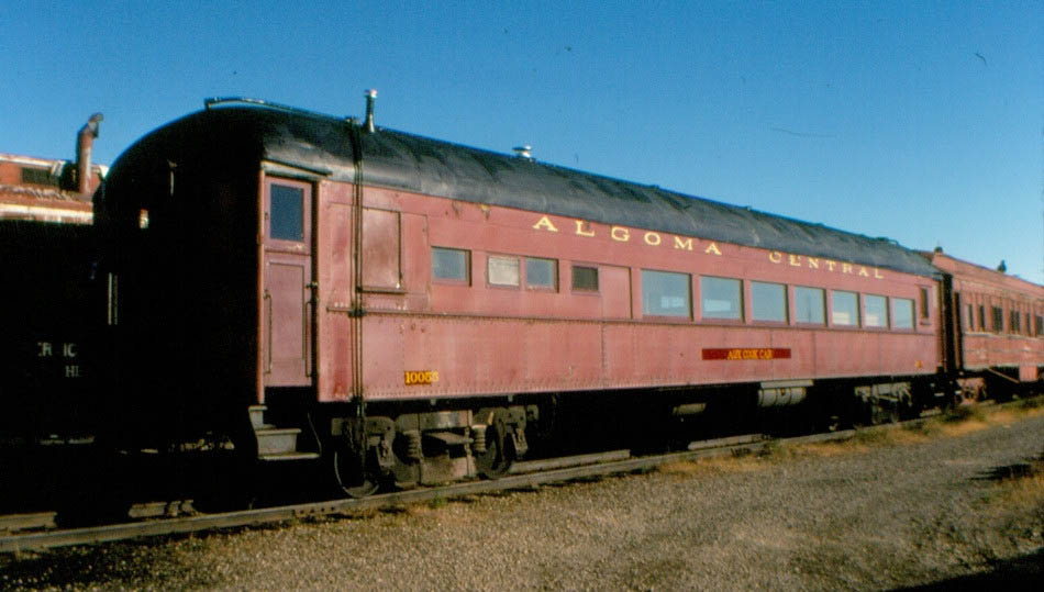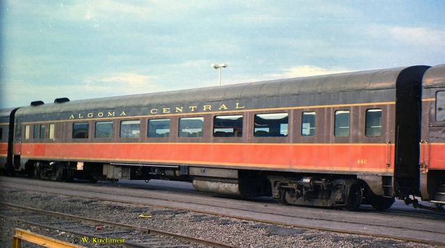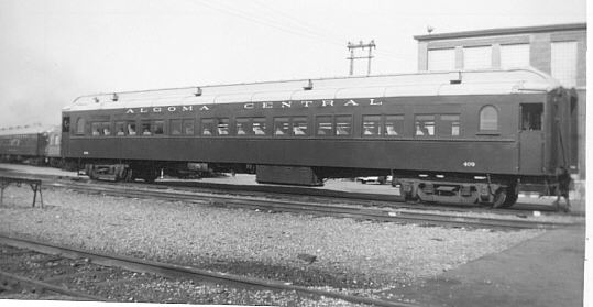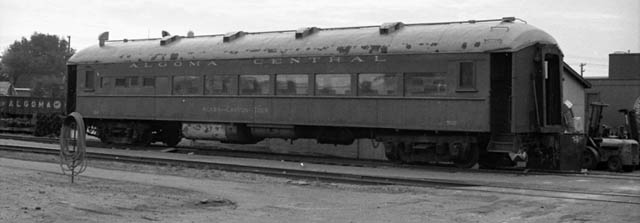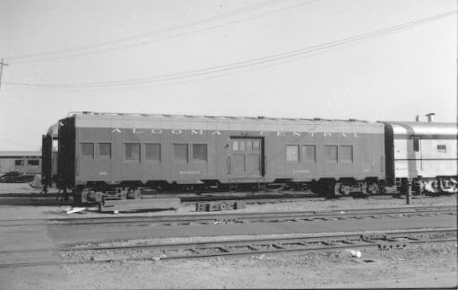 In 1949 steel passenger cars finally came to the Algoma Central, although like much of its earlier equipment, it was secondhand. From the Denver and Rio Grande Western came 13 light 4-wheel truck open window coaches, three of which were converted into cafe cars. Also acquired were five ex U.S.Army troop box car style sleepers only built in 1944 for World War II use, these were converted into baggage cars. Old wooden passenger coaches were downgraded to work service equipment and served for many more years until replaced by the ex D&RG steel coaches or modular units on flat cars.