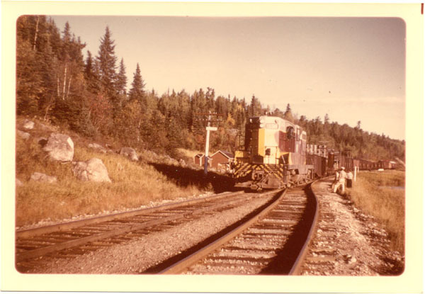 Another variety of paint scheme on 156 on southbound wayfreight at Tabor, Mile 141, in 1963. Note rule instructor's car behind the caboose.