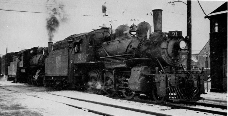 Light snow is falling as CNR 91 and 87 doublehead along Ferguson Avenue in Hamilton. Reg.Button 91 was originally saved in June 1959 by Charles Matthews a house mover in Langstaff, Ontario and a collector of Canadian transportation artifacts. His collection was purchased in 1965 by the Government of Ontario for the still-born Transportation Musuem. The locomotive collection was disbanded with 91 sold in August 1969 to Fred Steck of Reese, Michigan who restored it to operating condition for his private Reese Central. Fred sold it in December 1984 to the Middletown and Hummelstown in Pennsylvania where it operated for a brief time and where it remains stored after a recent (2004) restoration to very brief operation. (below)