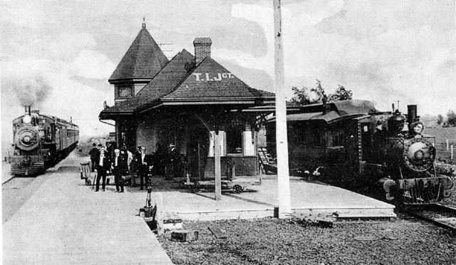 1894 from the Intramural Railway This station was built by the GTR in 1901 and was later re-named Gananoque Junction, thus the railway ran from Gananoque to Gananoque Junction! It had two official stops enroute, one not far out of the Junction at Cheesborough, a small settlement of a few houses where a cheese factory operated until 1938. The other stop was at an umbrella shelter on King Street in Gananoque. Canadian National Railways took over the bankrupt GTR and continued operating it as a separate railway due to its unique tax exempt status. When this exemption was ended in 1958 by Gananoque there was no longer a need to keep it as a separate company and the Thousand Islands Railway was amalgamated into the CNR December 12, 1958. Further changes took place with the end of passenger service by 1962 and the decline of freight service with the last customer ending use of rail in 1995. The entire railway was abandoned and dismantled in October 1997.