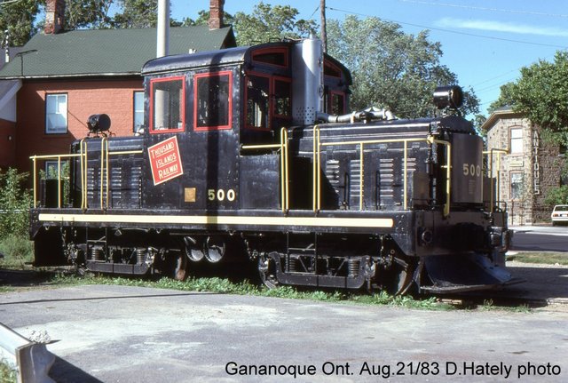 TIR 500 on display in Gananoque. Thousand Islands Railway 500, one-of-a-kind homebuilt diesel rebuilt by CN owned-Oshawa (electric) Railway from an electric locomotive. Trucks and traction motors from Oshawa 42 were utilized along with twin 125 HP Waukesha gas engines. Other parts were provided by Whitcomb, who assigned it their builders number 50006 12/30. This tiny 35 ton unit operated briefly on the Oshawa Railway before becoming Thousand Islands 500 in March 1931 where it operated on the tiny CN-owned railway. In 1947 it was re-engined with twin 142 HP Cummins diesels. It was retired in April 1963 and finally put on display in April 1966 in Gananoque where it ran most of its life.