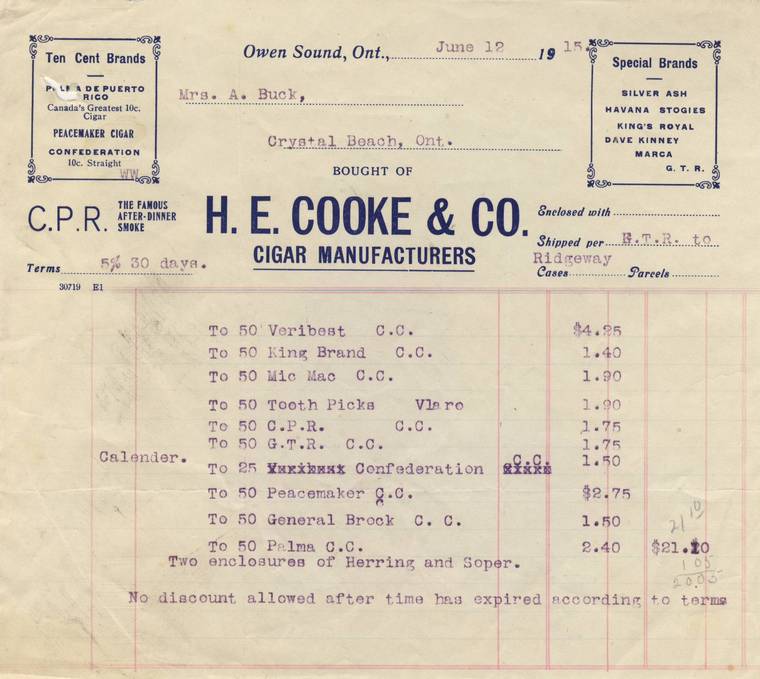 Grand Trunk Railway Cigar makers invoice for small shipment from Owen Sound via G.T.R.