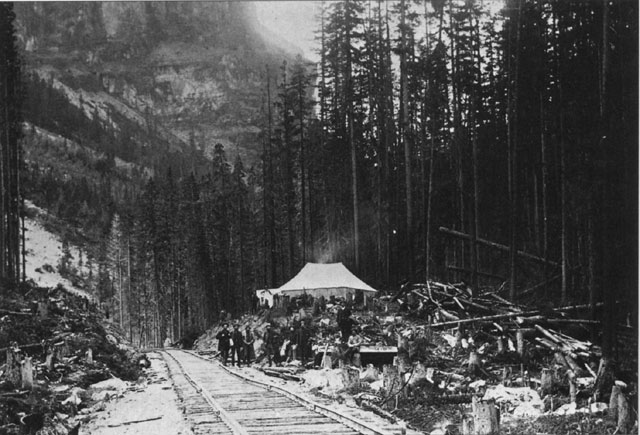 Construction on the Big Hill in 1884, Mount Stephen in background. Glen Bow Archives NA 782-9