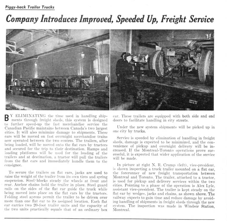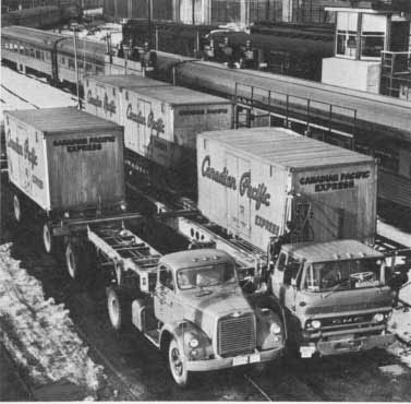 Intermodal Pioneer By R.L.Kennedy Canadian Pacific was an intermodal pioneer at a time when piggyback was all the rage. The 1950's saw railways everywhere in North America seeking to stem declining freight traffic that had been lost to trucks. To do this, they offered truck companies fast freight trains, often dedicated solely to handling only highway trailers on modified flat cars. It was officially designated as TOFC, for Trailer On Flat Car, but usually referred to as Piggyback or just "Pigs". The C.P.R. did this too, but decided to tackle it more directly. In addition to moving the trucking companies' trailers, they decided to get into trucking in a big way.