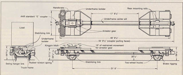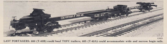 Canadian Pacific turned to General Motors DIESEL for an answer. What could a locomotive builder offer? At this time with dieselization of Canada's railways nearing completion GMD was seeking other things to build to keep its London, Ontario plant busy. It did this by producing Steam Generator Units for the CNR, and mobile generating stations, but needed more projects. Enter CP and its quest for "something else" to answer the needs of handling truck traffic. They wanted to leave the wheels behind, cut down on weight, have random access when loading and unloading., and they wanted FAST loading and loading, no more than two minutes! GMD took on the challenge, with CPR and Smith Transport joining in. Sam Smith provided a trailer with a de-mountable tandem wheel set. CPR committed to operating test trains, and GMD soon produced a truly unique freight car; the PORTAGER. Named for its task of "portaging" freight over land, as had been done by pioneering voyageur traders using canoes. Designated as T-40 (transporter of 40-foot trailers), it was a truly unique piece of rolling stock. A 30-ton capacity, 44-foot, four wheel, light-weight (13 ton) freight car capable of carrying a single 40' container. Swing hangers, featured on the EMD Blomberg locomotive truck, as well as many passenger cars, were utilized on two single axle wheel sets in place of standard four-wheel trucks. It was held together by a 16-inch pipe! (Later replaced by a cheaper 16-inch I beam). This wasn't the only unusual aspect of the Portager, there wasn't even a deck! Side loading eliminated the need to drive over the deck to reach other flat cars, so it was eliminated, along with its expense, and more importantly, tare (dead) weight. The first car was turned out in the spring of 1959.