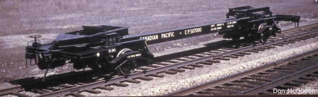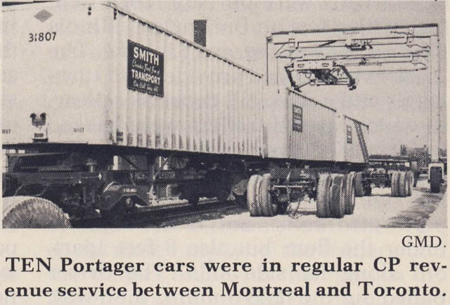 Winnipeg July 1956 CP Corporate Archives CP began getting into trucking in a larger way when it bought some small western truckers and formed them into CP Transport. Then in 1958 a major change took place when Canadian Pacific purchased 50% of Smith Transport, Canada's largest trucker. Smith also served New York and was the eighth largest in the U.S.A. CP quickly decided the conventional end-ramp method of loading and unloading piggyback trailers, known as "circus loading", for the way circus trains were handled, was not efficient. They set out to find something better. They looked at Flexi-van, built by Strick Trailer, a subsidiary of Fruehauf (one of the biggest manufacturers of truck bodies and trailers.) Flexi-van was a COFC (Container On Flat Car) with two turntables on the flat car, that left the rubber tires and wheels behind to save weight and reduce wind drag. It was highly touted by New York Central, but CP wanted something else. Pennsylvania RR went at it another way. They got into rubber-tired devices that straddled the train and lifted the trailer off in random access. CP wanted something else.