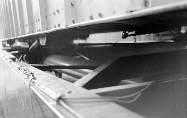Close up of unique 16" pipe centre sill, in later versions replaced by 16 ft. I beam. Three photographs: R.L.Kennedy CP converted six heavyweight passenger cars into unique 83'2" container flat cars. Initially, two cars with passenger series numbers 4000 (ex 4407 baggage & express) and 4001 (ex 4487 baggage and express), (later re-numbered 520000 and 520001 for freight service), complete with steam heat and communicating-air lines. These cars each carried four CP Express containers and were operated (one each) on the head-end of trains 22 and 21 between Toronto and Montreal.