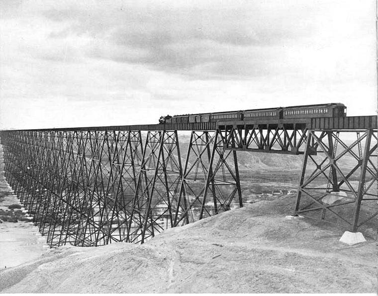 Famous Lethbridge Viaduct built in 1909 was a record-holding 5,328 feet long and 314 feet high crossing the Oldman River. Canadian Pacific Archives |