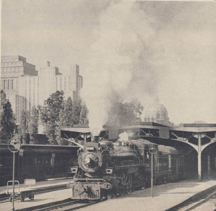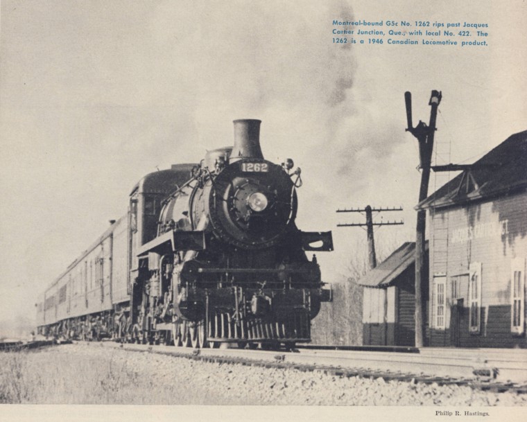 She went West, a twin, No. 1201, stayed East, and trials were staged under all manner of operating conditions. Dynamometer engineers reported coal and water rates of great economy, so in due course 30 more were built by the Montreal Locomotive Works, 15 for each region - Nos. 1202 - 1231. Stokers were made retroactive and the new series, G5b, mounted Elesco exhaust steam injectors under the fireman's seatbox. Two of them had welded boilers, and completing the wheelbase was probably the simplest trailing truck ever devised: not a truck at all, but an axle carried in the rigid frame with overwide pedestals set at a backward angle so when the axle moved laterally on curves, the journals were displaced longitudinally, giving truck action. Another 40 were duly procured in 1946 for distribution in the usual ration as operating officials clamored for more of a good thing. Montreal built Nos. 1232-1251; Canadian Locomotive delivered Nos. 1252-1271. Save for coaming around the top of the water compartment on the tender and relocated injector piping, sub-class 'c' engines were duplicates of their predecessors. Sixty-two new little Pacifics were now handling a great proportion of the local and branch-line trains to say nothing of Nos.1 and 2 between North Bay and Fort William Ont. - plus turns on helper, way freight and pickup runs. By their very employment they were denied the high mileage of bigger engines, but the G5's availability was more than adequate. Much of the postwar traffic surge was moved by this fine power. Then in 1948, steam no longer dominant in their locomotive plans, CPR motive-power men closed off the G5 class with the final 30 (Nos, 1272-1301) from Canadian Locomotive, all assigned to the Central Time Zone. The third variation in water preheating was applied, a revised Elesco poling its vertical bundle through the smokebox. This required a water pump and a place had been left for all along, covered with a piece of boiler jacket. It was on the left, borne on a skillfully frame-mounted casting that relieved the boiler course of weight-carrying studs and balanced the air pump hanging similarly over the main driver on the right. You won't see many locomotives with an air pump on the right. You won't see any locomotives like Nos. 1200-1301 at all as a matter of fact until you go up onto the Canadian Pacific. Everbody should travel on this great railroad before he dies; the engines that, although a little late, started a small power revolution. If you stray off the main line at all, chances are you'll have one on your train.