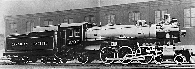 Scarcely heard amid the blasting tramp of Jabelmann's million-pound Union Pacific Big Boy - and completely drowned out by the snarl of Dilworth's Electro-Motive diesels with their wrenching drawbar pull were the CPR's sideway steps into the neglected field of branch-line power. In 1938 some 20 dainty 4-4-4's had been born of the realization that big engines couldn't forever be downgraded to all duties and that the light locomotive deserved research in its own right. In the late winter of 1944 the final fruit of this philosophy opened her cylinder cocks and coughed wetly out of the road's Angus Shops into Montreal's frigid sunshine. No. 1200 was a Pacific, but smaller than any built since World War I, and the first of a line destined to die young, its promise broken by internal combustion and electric transmission. There were then some 2004-6-2's working the Canadian Pacific's many miles of branch lines and some of its main lines too. These were of two groups, differing only in driver and cylinder size, and were all at least 30 years old. The new Pacific maintained the same general dimensions, had an identical tube-sheet layout in fact, and with 70-inch drivers, was given the same tonnage rating. But from front, where a steel casting replaced an oaken pilot beam, to back, where a Pyle-National lamp replaced an oil lantern, she had bestowed on her every development deemed suited to her kind of railroading. There were literally scores of improvements, and their cataloging belongs to the locomotive Cyclopedia, but here are some of the outstanding devices applied for the first time to a standard locomotive of these proportions: Roller bearings were specified for the engine truck for reliability and ease of maintenance, and likewise a mechanical lubricator. A Signal Foam Meter and an ET brake schedule were in the design. A front-end throttle - CPR precedent dictated that the rod should run neatly through the handrail - and its inseparable partner, the bottom slotted dry-pipe used for some years on this railroad instead of a steam dome, were applied. The 1200's vestibule cab was sprayed with an asphaltic goo instead of lined with tongue and groove, and her tender carried a well-sprung 8000 gallons to replace the 5000-gallon tank dubbed 'bobtail' by CPR huggers. She flaunted her air-operated chimes up on the base of her stack, and her stack was high beside her huge contemporaries: and her lines were as impeccable as her gold striping was modest. CPR's Tuscan glory was reserved for the spectacular big power.
