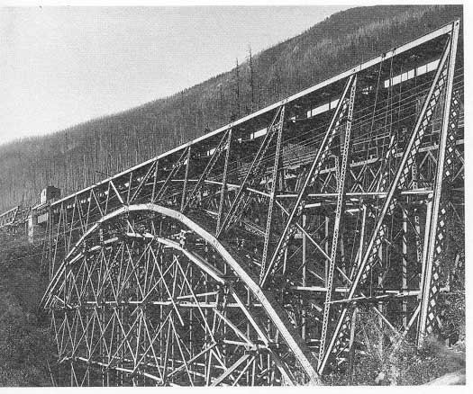 Surprise Creek steel arch structure under construction c.1895 with original timber structure in back. This structure was to suddenly collapse in 1929 under a locomotive killing the two enginemen.