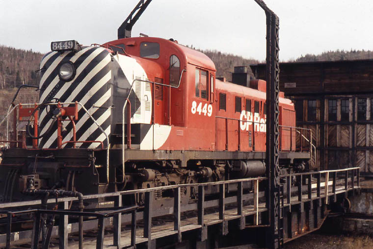 RS-3 8449 (MLW #81035 11/54) sits on the table in its nice new CP Rail Action Red paint scheme with Multimark logo. November 1972. This unit would later be given a chop nose and be restricted to yard service. |