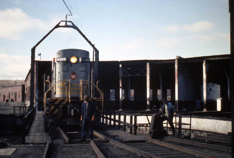Table "boy" is stepping on the brake while his helper gets ready to pull the dog into place to hold the table while the unit moves off of it. Brand new passenger service RS-10 8480 (MLW #81069 3/55). April 1955. Bill Miller