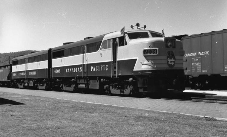 4008-4404 the first pair of MLW FA-1 and FB-1 (#77303 and 77325 6/16/50) 1500 hp units of a single order for 20 A and 20 B units. They were the only ones. Earlier units were built by Alco in the USA and later MLW units were the newer model, 1600 hp FA-2 and FB-2. These units first passed through Schreiber on the night of June 28th and returned in daylight a day or two later shown here displaying signals (green flags). Harry Hart