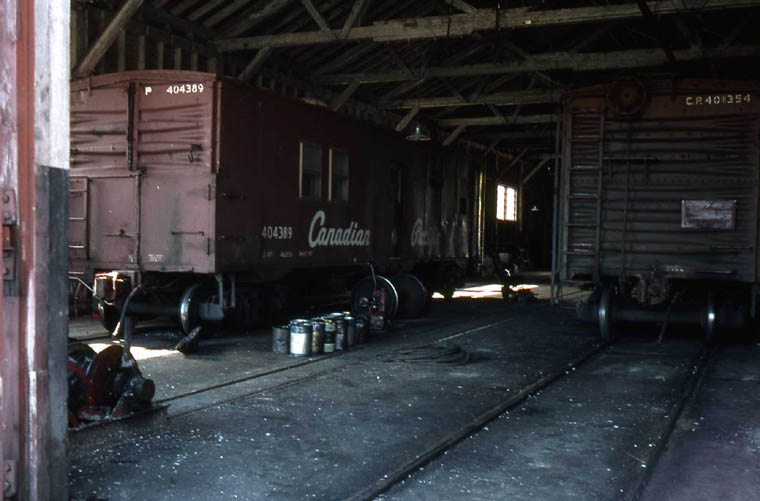 Interior view of east end of the car barn looking west with two OCS cars inside. November 1976. Note: 404389 on 11 track is a Car Dept. road car. 401354 is on 12 track. |