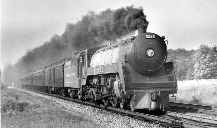 "Trailing black smoke" was entered into work reports by enginemen many times when operating F1a 4-4-4 "Jubilees" on the Toronto to Hamilton run. Here, No. 2925 is doing exactly this as she roars through Lorne Park on Train No. 732 on the morning of August 21, 1953. The reason for the smoke is that the tubes are becoming blocked and "honeycomb" or slag is forming over the back tube sheet in the firebox, preventing proper combustion. This condition was prevalent on these engines when worked at speed with light trains on relatively level track. When this engine and her running mate, No. 2928, were assigned to the Hamilton to Goderich run and were returned to John Street, Toronto, for their monthly boiler wash, the tubes were observed to be in excellent shape. This was put down to the heavier working of the engine on the Goderich run, due to the up hill, down dale, character of the line. Working on grades with heavy exhaust had a scouring effect, keeping the tubes clean. During my time on the boiler staff at John Street, I had the unique experience of observing my night's handiwork roar past our farm on fast passenger trains. When I got home to Oakville, Train No. 721, the morning Buffalo, and No. 731, the Hamilton local, would roll by. Train No. 731 was frequently hauled by No. 2925. One morning in the spring of 1948, while eating my breakfast, I heard a sharp report similar to a track torpedo as No. 731 raced through. Jumping up, I looked out of the window to see the train pulling up in an emergency stop about half a mile away, Running up to the level crossing near our place, I saw a small pile of lumber and a carpenter's tool chest on the track. On the other side of the crossing was a small truck chassis parked with its motor running, and a group of men standing, talking. No. 2925, travelling at more than 60 m.p.h. had clipped the truck's rear overhang with the right corner of its pilot beam, and had separated the truck body from the chassis. It was a cool morning and the men said that their side windows were fogged up and they had not seen the train. When the accident report was completed, the men clambered onto the chassis and drove off, none the worse for their experience. No 2925 sustained a small dent to the pilot beam. Twenty F1a's were built by CLC in 1937-38. Fifteen were assigned to the Western Lines and the remainder to the east. John Street received four, Nos. 2925 to 2928, while No. 2929 went to Glen Yard, Montreal. During the early 1940's Nos. 2926 and 2927 were transferred to the Quebec and New Brunswick Districts, with No. 2928 going to New Brunswick around 1955, when bumped by dieselization. No. 2925 ended her days at John Street, assigned to the Toronto to Peterborough run during early 1957. By May of that year she was classified as waiting repairs at Angus but was scrapped on July 12, 1957. | ||||||