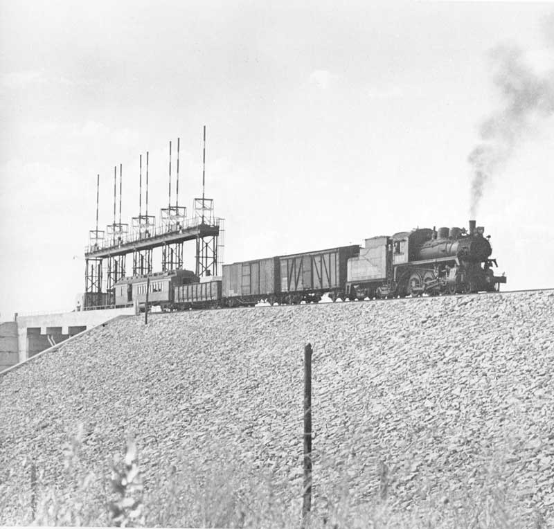 Elora Mixed hauled by D-4 class Ten Wheeler 452 as it crosses the Shand Dam. Built in 1939, it resulted in a diversion of the Elora Subdivision across the dam.