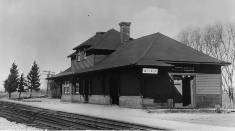 Northbound passenger train arriving at Beeton in this early postcard scene with local omnibuss. Collection of Doug Birchill