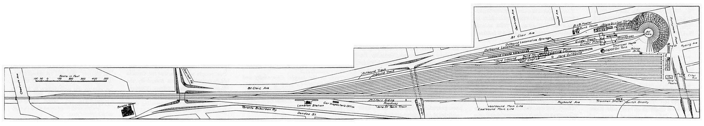 The main line from Toronto, and beyond these new terminals, is double tracked. The westerly entry to the terminals leaves the main line at Chadwick Avenue, from which point into the yard ladders there are two leads 2,000 ft. long for arriving and departing trains. These will accommodate 55 car trains. The main part of the yard is double ended and is divided into two sections, for arriving and departing trains, each with a capacity of 500 cars. The arriving yard is the southerly of the two and extends from Jane Street to the easterly end. The outgoing yard extends the full length of the yards, from the Lambton Station, The combined yards have 20 tracks, located at 13 ft. centres. To the north of the east end of the yards there is a 12 track freight car repair yard with capacity for about 150 cars. It is arranged with two leads from the north side of the main yards, the central tracks having a car capacity of 22, with the outside tracks accommodating only three or four. Between every other pair of tracks there is a 2 ft. service track, connecting at the east end by turntables to a track running along behind the earth bumpers. The wheel storage tracks are at the north end of this track, in the open space opposite Ryding Avenue, where four sets of storage tracks are being installed. At the south end of the locomotive house there is a pneumatic jib crane over the service track for unloading the wheels from cars on the northerly of the car repair tracks on the track leading into the storage yard. This track is arranged for both standard and narrow gauge. On the track behind the bumpers there is a narrow gauge car, with a carriage top, on which the wheels are run for distribution throughout the yard. The car foreman's office is in the building to the east of the repair rack yard, and in the same building are housed the car stores and a small blacksmith shop of one forge. The front of the building is planked, and against the building are material bins for rough car stores. The car stores in the building are contained in 4 tiers of double bins. The building also contains an oil room, lunch room for the men, lavatory and tool room. This yard is not intended for the handling of very heavy repairs, these being handled for the most part in the main shops at West Toronto. The average capacity is 100 pairs of wheels and 200 long sills per month. The yard is in charge of J.J. Bannon, Car Foreman. The new locomotive house and motive power handling facilities form the main part of the new terminals. The locomotive house is built entirely of concrete and has 20 stalls (sic. 30 stalls), the building being divided into three sections. It opens to the southwest, the entering tracks coming from the east, there being provision for the addition of a further 10 stall unit when required. This locomotive house handles all the power formerly accommodated in the old building adjoining the locomotive shops in West Toronto. In the centre there is an 80 ft. turntable operated by an air motor tractor. The inner radius of the locomotive house is 95 ft. and the outer radius 180 ft., giving a depth of 85 ft. As mentioned, it is of concrete construction, with large window area in the outer wall. The roof is of 2 by 5 in. planking, laid on edge, and covered with fireproof sheeting. It is supported on the walls and two intermediate circular rows of concrete columns. Over the forward end of each track there is a Johns-Manville asbestos smoke jack. Each locomotive house track has a 65 ft. concrete pit, with convexed bottom, sloping to the inner edge for drainage, a pit for this purpose and for the piping being located the forward end of the pits, passing around the building just inside the inner wall. The sides of each pit are planked with heavy planking for a width of 2 ft., the balance of the floor being of cinder construction, with the exception of the central section of 10 stalls, which is paved with concrete. The three pits at the shop end are drop pits, the first one for front truck wheels, and the next two for driving wheels. The intervening space between these pits at the shop end is floored with heavy planking, on which the wheels can be run from the wheeling tracks, and then into the machine shop. Alongside each smoke jack, at about 8 ft. centres, there is suspended a light trolley with a 6 ft. rod attached thereto, the tracks being about 36 ft. long. This length covers the locomotive forward of the cab and is found most useful in the handling of the exterior locomotive fittings such as the bell stand, etc., without the necessity of slinging a block and tackle over a beam. A block and tackle is attached to the trolley to be used, and can be moved along the length of the locomotive at will. The trolley capacity is about 1,000 lbs., which is ample for the handling of such light fittings as would come under running repairs. Only light repairs are handled here, the heavy ones being sent to the nearby locomotive shop in West Toronto. The general lighting of the locomotive house is by clusters of three 32 c.p. incandescent lamps suspended from the roof near each of the columns. These lights are controlled from a central switchboard panel in groups of 3 pits. In addition to this general lighting, there are incandescent lamp sockets around the walls, and in each pit there are two lamp cord connections. The indirect system of heating is employed throughout the locomotive house by means of batteries of pipes in the pits and along the walls. In the pits along each wall there are four lengths of pipe, with similar units along the outer wall. Exhaust steam is employed, supplied through a pipe in the circular pit. The pit also contains a 2 in. steam main, 3 in. water main, and a 1½ in. air main. These all have connections to the columns between the pits. Near the entrance from the locomotive house into the machine shop there is a Miller washout plant which is found very useful. Three sets of piping run from this plant, suspended fr