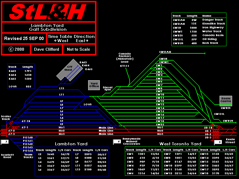 Lambton Yard which got its name from the little village of Lambton Mills, was the main freight marshalling yard and included West Toronto Yard located in the "Junction", which in turn got its name from the railway junction of several lines. It stretched from the Diamond past Old Weston Road (overpass bridge), Keele Street, Runnymede Road, Jane Street and Scarlett Road, all subway underpasses, almost as far west as the Humber River. Keele Street many more photos.
