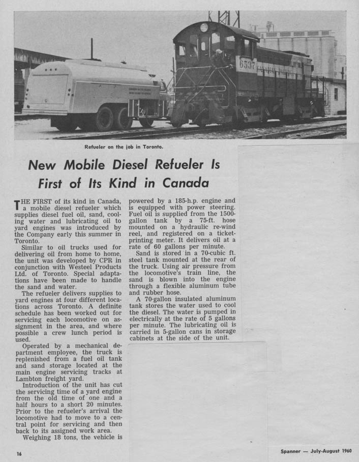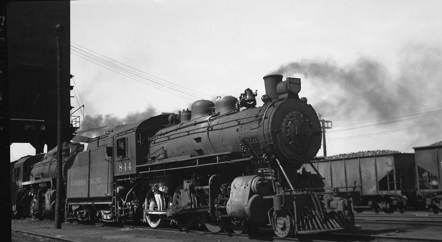 2644 4-6-0 MLW 96553 10/1909 (Renumbered 3/1913 D10f 844) November 28, 1911 The CVR roundhouse and car shops at Parkdale were built in the 1870's, following the beginning of construction in 1874 and the opening of the first portion of the line in 1877. They were soon to become inadequate to handle increasing traffic and this brought about the West Toronto shops and yard. (Parkdale shop remained in use until 1907). In 1891 a brick roundhouse was built with a rectangular machine shop and blacksmiths shop along the back of it. The roundhouse was later expanded to 32 stalls. A large 15 track erecting shop with a transfer table was added. Also built was a car shop, complete with a transfer table, making West Toronto the only location in Canada having two transfer tables, (these move laterally rather than in a circle as a turntable does.) The car shop was expanded handling both freight and passenger equipment. In later years a new coach shop was built at John Street and the West Toronto shops concentrated on freight and service equipment including rebuilding wooden vans. The largest steam locomotives that could fit into West Toronto roundhouse were D-10's and these were soon replaced by bigger power for heavier freight trains. Prior to the Great War (World War I) a D-10 and 35 cars was a full-sized freight train. West Toronto yard was expanded, but this wasn't enough and a new yard was built (Lambton) adjacent and to the west of it, from Runnymede to Scarlett Road. A new larger (Lambton) roundhouse was built at Runnymede and St.Clair. It originally had 30 stalls and was later increased to 37, with others made longer to accommodate bigger power, including P2 class 2-8-2's. West Toronto roundhouse continued in use for yard steam engines and later diesel yard switchers. In the early 1950's the newest portion of the roundhouse, a separate 11-stall section was no longer needed and was demolished. Stored in there had been a genuine 4-4-0, #30. It had been a spare engine for the old K&P, a light branch line and had last been used in 1949 in the movie Canadian Pacific starring Randolph Scott. Only three others remained on the roster, the famed trio of 29, 136 and 144, all destined for preservation. The Erecting shop (a.k.a the Back Shop), performed medium overhaul work on steam locomotives, while Angus Shops in Montreal did major, heavy rebuild work. Angus also built brand new steam locomotives! The last steam engines repaired at West Toronto were: 807, 2332, 3607, 5116 and finally 1098, which left on June 29, 1957. Road diesels were maintained there for a short time, but the shop was loaned to the Engineering Dept. for Maintenance of Way machinery repair. The roundhouse was later used by the Bridge & Building Dept., and the Signals & Communications Dept. The turntable remained in use to turn diesels, both road and yard power, also the one track running through into the erecting shop, remained in place.