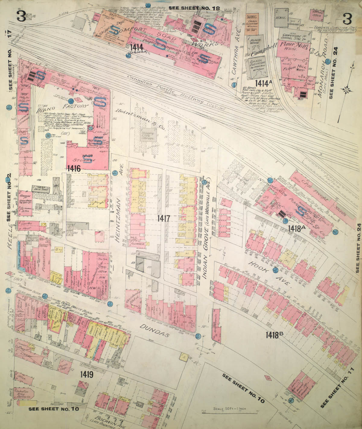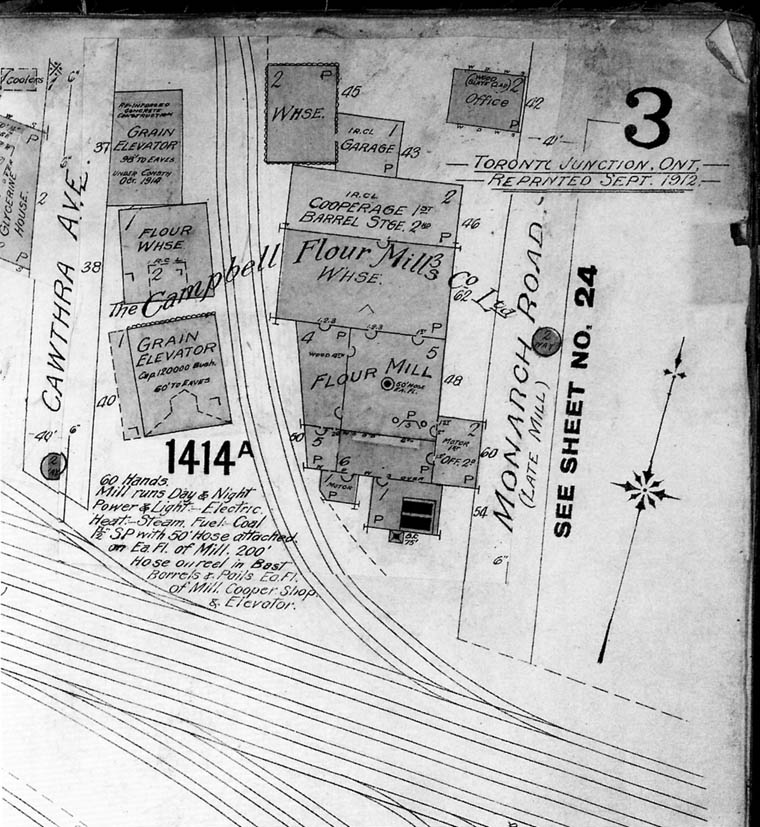 Toronto freight office and shed at left. Maple Leaf Milling at right.