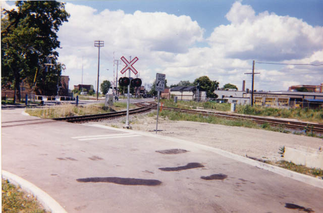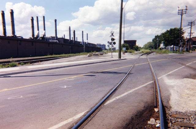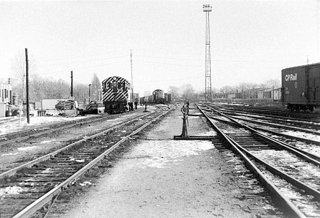 the Day Transfer, 5731-8921 with engineer George Koch. July 1984. R.L.Kennedy Jane Street underpass had been rebuilt previously beginning June 1,1971 and re-opening to road traffic November 2,1972. Keele Street (built c.1890, rebuilt 1928) and Scarlett Road (1912), both remain at their original narrow width. A new freight shed for pool cars was built on the site of Lambton Roundhouse in 1966. It replaced the smaller North Toronto Shed being used by Tormon (Toronto-Montreal Assembly Agency) which handled traffic for various Department store chains. Later, this operation was again relocated, this time to an even bigger shed at Toronto Yard. The shed and office were rebuilt in 1982 to enclose the box cars while being loaded. This time the tenant was another Pool Car operator, Consolidated FastFrate, which relocated from a smaller shed at Parkdale. Musical sheds! Labour Day weekend of 2000 saw one more move, when Fast Frate relocated from Lambton to a brand new shed at Vaughan Intermodal Terminal, it opened September 5th. The change over from box cars to containers was now complete, there is not one piece of track at the new shed! The first major alteration to the yard (other than building Lambton shed), was the result of a new type of intermodal train, RoadRailer, which began May 15,1991. This system uses specially reinforced and equipped highway trailers and "bogies", or special trucks. It resulted in the removal of several tracks, 10, 12, 14-21 in Lambton Yard, leaving 11 and 13 and paving the entire roadrailer area. Iron Highway was a new method of handling piggyback trailers. It later became Expressway. Lambton Yard "closed" The most serious change, following the opening of Toronto Yard came about on October 20,1989, after a previously rejected proposal in June 1987. In an ill-conceived attempt to consolidate operations, Lambton Yard was "closed", at least officially. The operation was shutdown with local trains being re-assigned to Obico Yard or Toronto Yard, where the long-missing group of classification tracks was finally built and a third Pulldown job was assigned to cope with the increased traffic. The Roadmaster sat poised; it was intended to rip up all of West Toronto Yard! Had this happened it would have been disasterous, as there was simply no place else aside from Leaside, to store equipment, especially empty intermodal flats. Lambton would remain for trains setting-off or lifting. One employee worked out of the closed section men's shanty, called a "Switching Supervisor", he was in fact a yardmaster, and a car checker or anything else needed! This was a failure, due to the long distance to Toronto Yard causing overtime and delays getting traffic to/from there, along with congestion etc. After too long a period of time, following the transfer of the management people involved in this fiasco, the yard was re-opened, although everyone knew it had never really been closed. Gradually, yard jobs were re-established at Lambton beginning with 18A at 0700 March 21,1994. Late in 2008 a big Recession hit North America and Lambton Yard was once again closed in April 2009. This eliminated four yard jobs; 10A 18C 19B and 80D. (last job 10A engine 1578-1013 Sunday, April 26, 2009) Also 250A Transfer ex Toronto Yard. Local trains (Streetsville RS, Obico A and Obico B) were relocated to Toronto Yard. Recovery of traffic brought about changes starting before Christmas 2010 when a yard engine (3 man crew inc. engineer, no more "Pitch and Catch" remote control) was established "24x7" as they say. These four jobs were called Lifter 1, etc. and were used to switch cars being lifted by outbound trains such as Honda traffic from Aliston. A Spence job operating to Toronto Yard was rerouted into Lambton to save travel time and delay. These were the only jobs. No other positions, management or car department were re-established. Finally, in May of 2011 the yard was fully reopened with a supervisor of train operations around the clock. (Down from 5-7 management people previously at Lambton). Local trains were moved back including the Emery, Obico and Streetsville jobs. A carman on days and afternoons was also restored. Connecting Track at the Diamond A new wye track was also built from the MacTier south and west into West Toronto Yard, opened July 19, 1999. Additionally, moves could now be made to and from the Galt Sub. to Obico. It not only made possible this move but also permitted trains to move easily in and out of the yard without backup moves which had become particularly difficult with the removal of vans (cabooses). In fact this connection had been proposed 50 years earlier! All trains to the MacTier Sub. from Lambton Yard and from MacTier to West Toronto Yard required a backup move either across the Diamond to the North Toronto Sub. or down the Galt Sub. in front of the Depot. When Lambton was the main marshalling yard this made for a lot of delay, although crews were used to doing this (without radios!), with a man on the rear platform watching and whistling, using the backup hose which included a whistle and an emergency brake valve. The whistle gave off a unique shrill blast that could be modified by holding and releasing your hand over it to give urgent warning signals. It was nowhere near as loud as a diesel horn, let alone a steam locomotive whistle, but it sufficed as a warning due to its shrillness. CNR Interchange One somewhat minor change resulted in history being made at Lambton Yard, when for the first time CNR trains began entering Lambton. This happened when the Interchange location was changed from Leaside to Lambton. West Toronto interchange had closed June 16, 1986 due to sharp curvature problems for new multi-level autocarriers. In the 1950's major Interchange points (places where cars were exchanged between CPR & CNR), were at West Toronto, opposite the Depot, accessed off the Old Bruce, and Parkdale/Bathurst St. While minor points included, Leaside, Cherry Street, Keating St