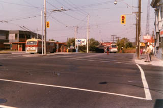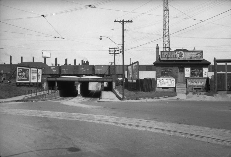 1954 Toronto Public Library/Salmon Collection Runnymede Road, south of St.Clair Ave.W. looking south, showing old subway (underpass) and new Lambton Yard Office. Left, view from east sidewalk at laneway north of Ryding Avenue. Right, west sidewalk and original fencing at the old "big gate" entrance. The roundhouse was once located behind the camera. R.L.Kennedy Note: Both images will enlarge.