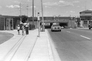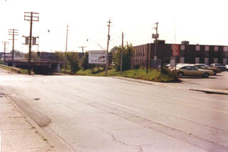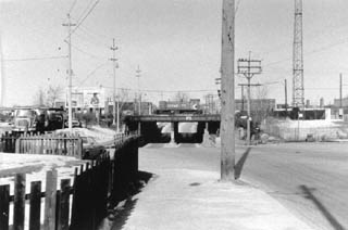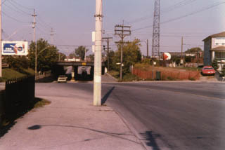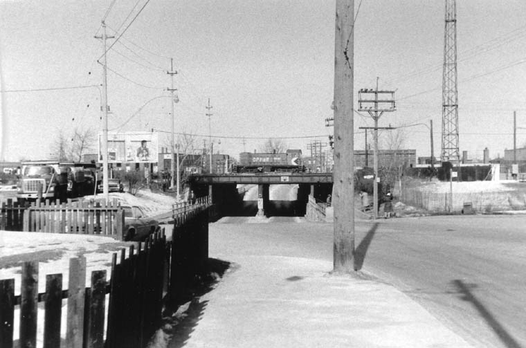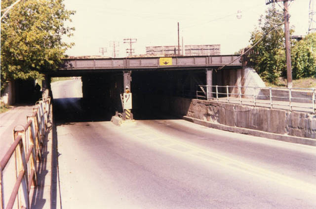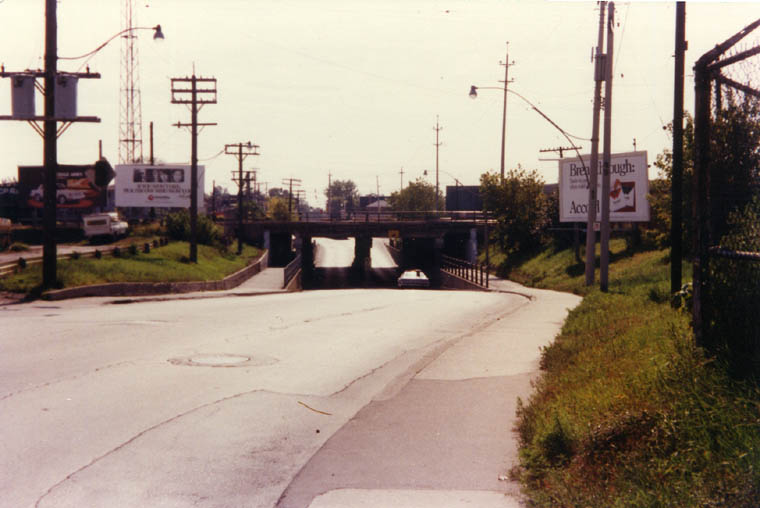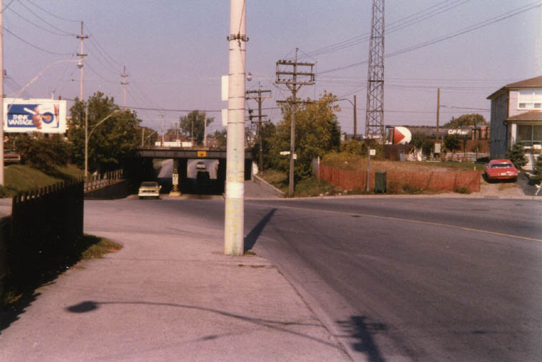Old subway on Runnymede Road, looking north.Galt Subdivision mainline is closest to camera. R.L.Kennedy A new underpass was constructed at Runnymede Road after decades of waiting, widening it from one narrow lane in each direction to two lanes each way. The street alignment was straightened out at the same time eliminating an abrupt curve necessary to take it across the City of Toronto boundary into York Township. The City would not fund the subway but, the Township did. Streetcar tracks once ran through the subway but, were never used. Work began May 25,1982 and re-opened to road traffic August 5,1983. It had been impossible prior to the opening of Toronto Yard to disrupt railway operations to rebuild the underpass. View looking north. Engine 6523 sitting on the bridge January 1981. Note the fencing and compare to next view which shows the new completed underpass. Once again, note the fencing, now you can see how the road was straightened out and widened. New houses are on Maria St. Old floodlight tower has been replaced by a modern one out of view to the right or east. July 1984. Both photos: R.L.Kennedy Note: Both will enlarge. Same view, September 6,