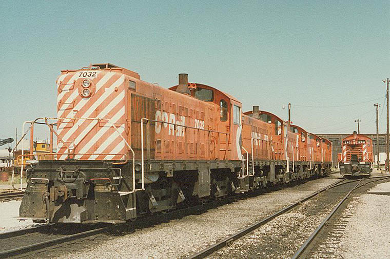 7032 Alco S-2 at the head of a row of yard switchers. 1240 SW1200RS