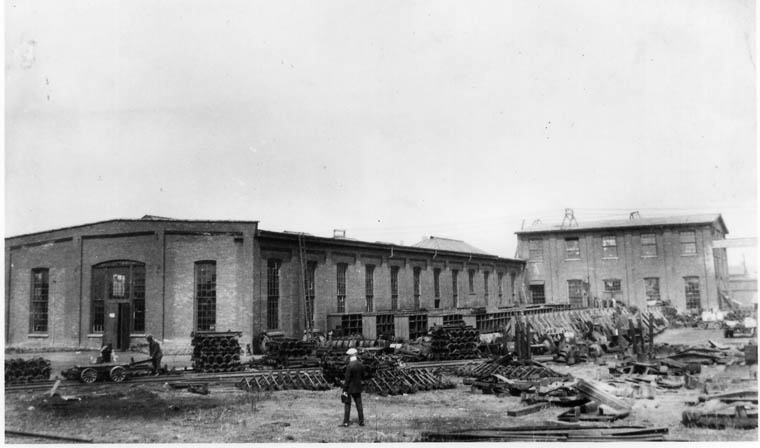 The stores building (rear) 1900. A second stores building (foreground) was added in 1906. It was similar in scale to the machine shop. Both long demolished. Canadian Pacific Archives A.3516