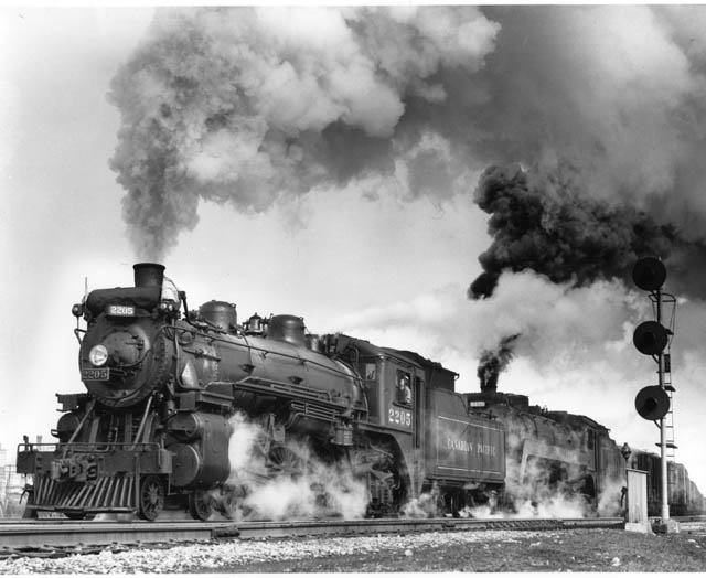 2205 and 5420 11.15 a.m. March 3, 1956, leaving Leaside Yard westbound for London, just two months before their doom in the tragic Galt Wreck, May 2,1956.